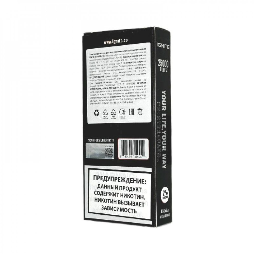 Технические характеристики Электронная сигарета Ignite V250 Black 25000 затяжек - Pineapple Mango (Ананас манго)